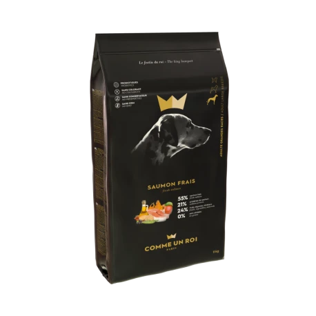 Repas complet pour grands chiens, l’alimentation sèche Comme Un Roi est très riche en protéines (76%) dont 55% de saumon frais et 21% de saumon déshydraté. Les croquettes sont sans céréales et élaborées avec des pois, des patates douces, de la pomme, à faible indice glycémique.