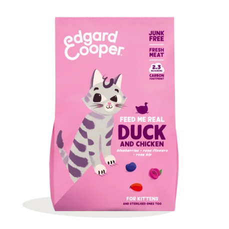 Une recette complète et sans additifs artificiels à base de canard élevé au sol et de poulet élevé en plein air, idéale pour les chatons en pleine croissance, même stérilisés. Attendez-vous à une avalanche de ronrons satisfaits une fois que votre chat aura goûté à ce festin préparé avec de la viande fraîche savoureuse (et qui n’aura pas été réduite en poudre, ni séchée, ni effilochée).