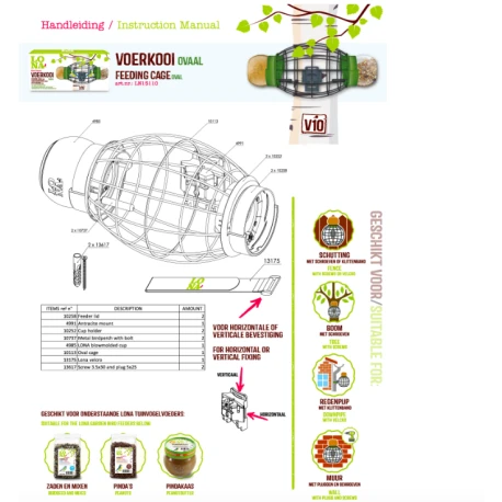 LONA V10 est une cage d’alimentation ovale qui protège les petits oiseaux de jardin contre les prédateurs naturels tels que les chats et les grands oiseaux, leur permettant de se nourrir en toute tranquillité. Nourrissez les oiseaux avec plusieurs aliments à la fois avec les 2 unités d’alimentation. Le V10 peut également être utilisé avec du beurre d’arachide LONA. Une vue fantastique! Et les oiseaux adorent le beurre d’arachide LONA.