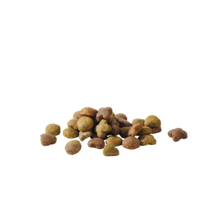 Viandes et sous-produits animaux (poulet 12%), céréales (riz 4%), sous-produits d’origine végétale, légumes (pois 4%, carottes 0,5%, tomates 0,5% et brocoli 0,5%), huiles et graisses, graines, substances minérales, levures, fruits (pommes 0,5%)